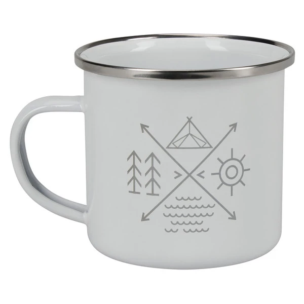Lackierter Emaille-Becher mit Frilufts Print und Edelstahlrand. Gut geeignet für den morgendlichen Kaffee am Lagerfeuer. Der Becher fasst 350 ml und misst 8 x 9 cm (HxB).